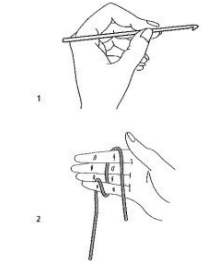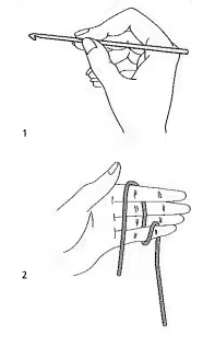 - Vous devez tenir le crochet dans la main droite, la pointe tournée vers le bas, le pouce et l’index placés de chaque côté de la partie aplatie de la tige.