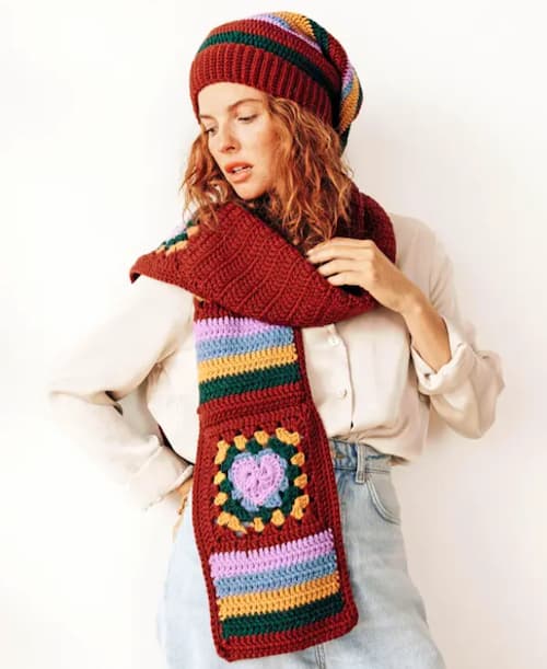Cette écharpe allie les carrés au crochet avec des rangs de mailles pour jouer avec les formes comme avec les couleurs.