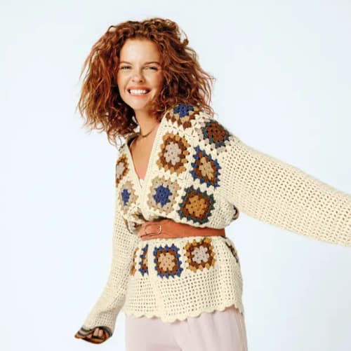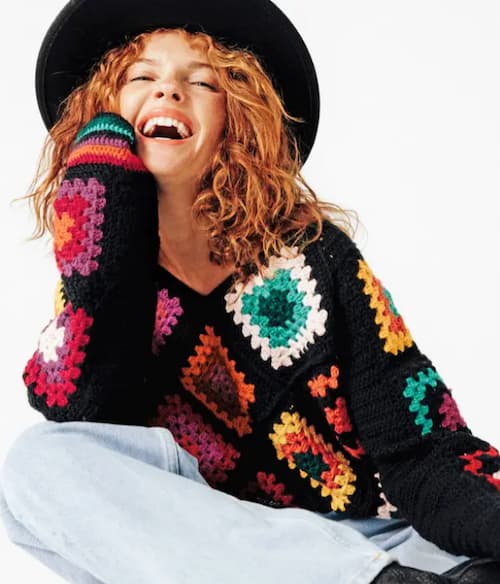 Aujourd’hui, on crée des carrés au crochet pour faire des plaids bien sûr, mais aussi de magnifiques pulls, des coussins, des gilets, des débardeurs, et même des robes !