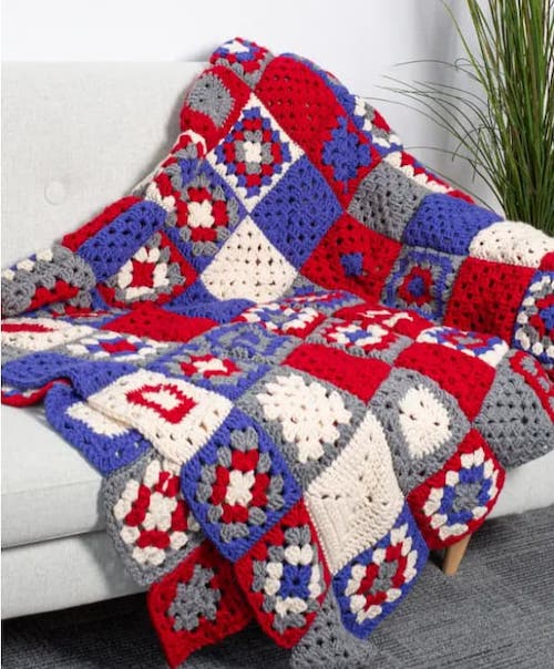 Un plaid esprit patchwork à crocheter avec un gros fil léger et doux et un crochet n°4. Idéal pour un premier ouvrage en granny square, ce plaid correspond à un niveau facile.
