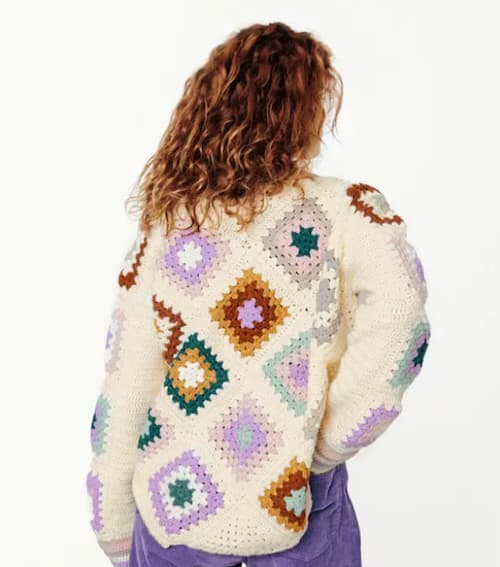 Un pull asymétrique aux multiples carrés granny qui fait appel à toute la technicité des expert.e.s en crochet !