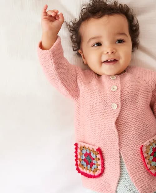 Un ouvrage d’un tout autre style ici… Les granny squares peuvent aussi être utilisés pour apporter une touche d’originalité : ici on couds des poches en carrés crochetés sur un classique gilet tricoté pour bébé !