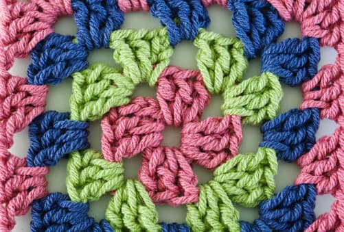 Un granny square ne peut pas être constitué d’une seule forme de mailles, contrairement à un ouvrage réalisé en rangs qui pourrait par exemple être formé uniquement de mailles serrées ou de demi-brides. Dans un granny square, on alternera les mailles en l’air avec d’autres formes de mailles, souvent les mailles hautes comme les brides.
