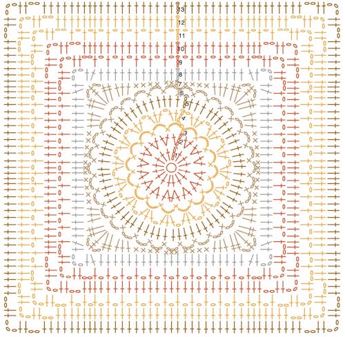 Vous trouverez toujours le patron d’un modèle de granny square sous la forme d’un diagramme : on utilise les symboles des mailles de base du crochet pour présenter le carré d’un point de vue graphique.
