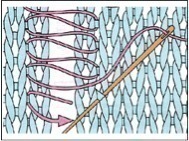- Repiquez dans la 1re en passant sous le tricot et ressortez dans la 3e. Repiquez dans la 2e, ressortez dans la 4e et ainsi de suite, jusqu’au bout du rang.