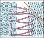 Côté A – Repiquez entre les 2 mailles du bord pour passer sous le fil suivant.