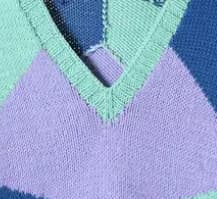 Un col V de forme simple peut aussi être tricoté en même temps que le tricot, comme pour ce pull au point jersey. On tricotera alors séparément chaque épaule, en faisant des diminutions de part et d’autres du col.