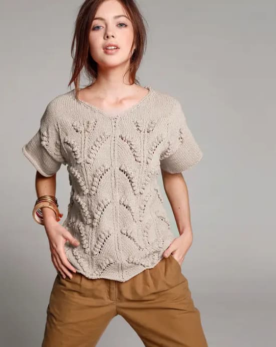 On peut aussi retrouver des formes d’encolures rondes beaucoup plus ouvertes et profondes comme celle de ce débardeur tricoté.