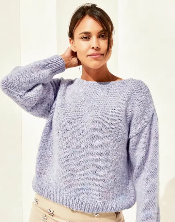 On pourra par exemple se contenter de rabattre les mailles au milieu du tricot pour laisser une ouverture entre les épaules. On obtiendra ainsi une encolure dégagée en col bateau comme sur ce pull Lana. Une encolure carrée sera également possible en suivant le même principe, mais en rabattant les mailles plus tôt et en continuant de tricoter les épaules séparément (voir les étapes de cette technique).