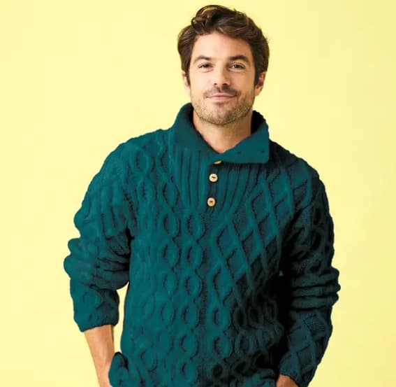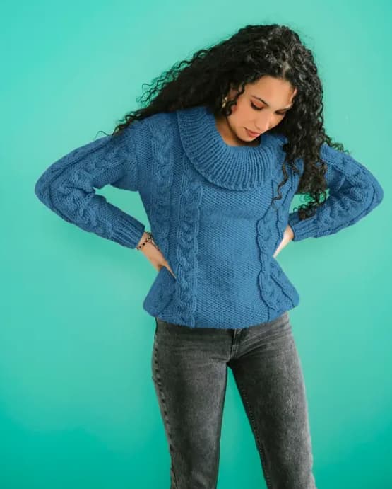 Pour un pull légèrement moins chaud et un cou dégagé, le col cheminée sera aussi une bonne option. Il se tricote généralement également avec une bande d’encolure que l’on coud ensuite lors de l’assemblage final.