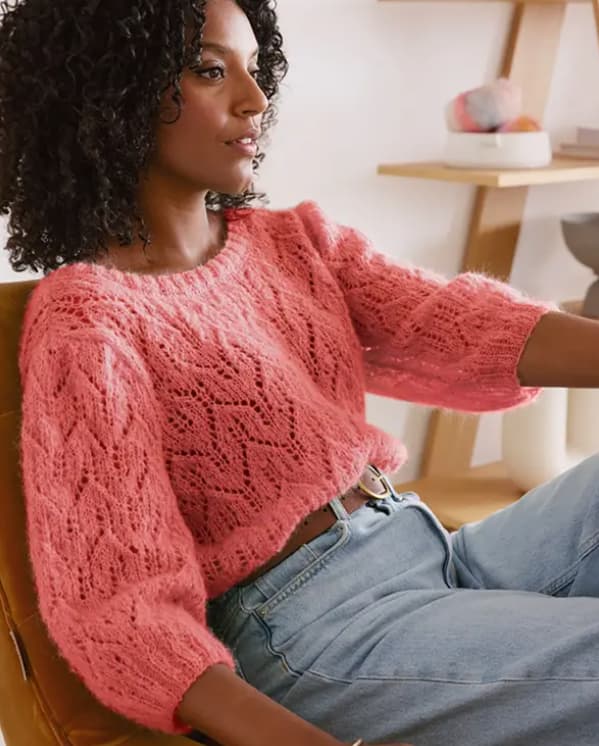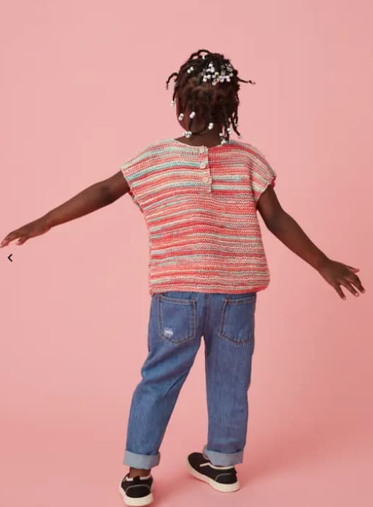 Sur d’autres modèles, on pourra aussi reprendre les mailles à l’aide d’un crochet pour réaliser une encolure au crochet.