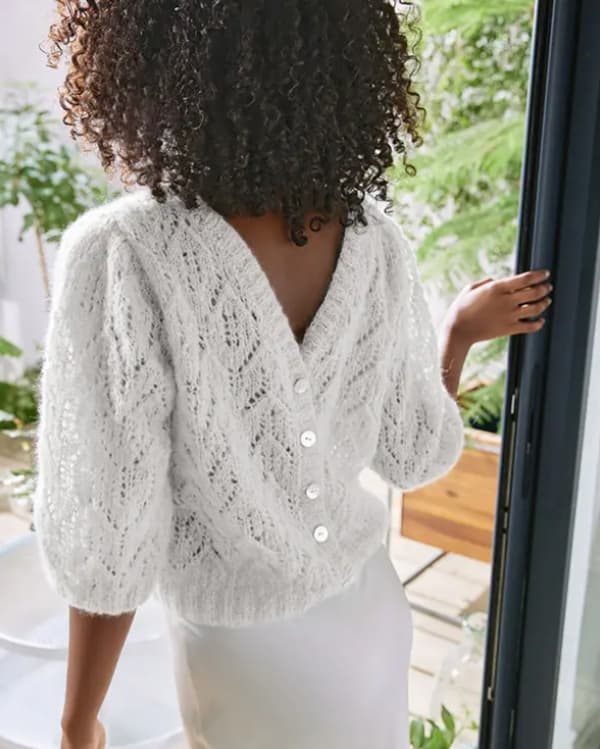 Pour un col en V plus travaillé, on pourra ensuite relever les mailles pour ajouter une bordure (voir les étapes de cette technique)