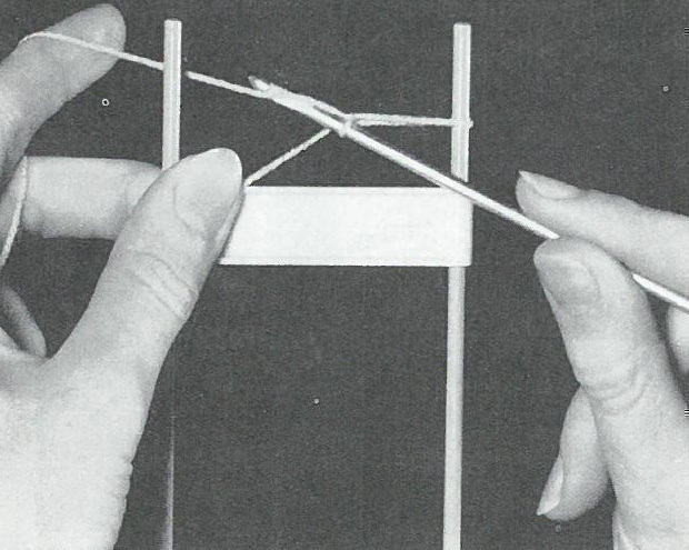 Etape 2 : tournez la fourche de droite à gauche. La branche droite devient la branche gauche. Tenez-là comme précédemment entre votre pouce et votre index. Le fil doit normalement avoir tourné avec la fourche. Piquez votre crochet sous le brin avant de la boucle de gauche, ramenez le fil, faites 1 jeté et tirez-le à travers la boucle de votre crochet.