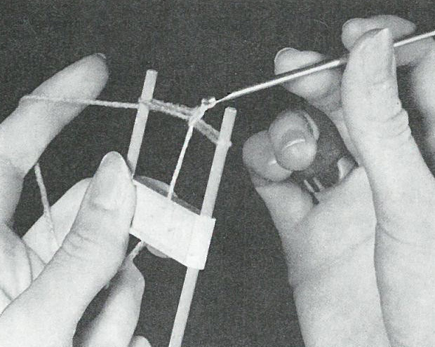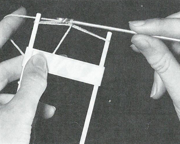 Etape 1 : tenez votre fourche dans la main gauche, juste devant vous. Vous pouvez même appuyer une extrémité contre votre corps. Enfilez maintenant la première plaquette sur la fourche et faites-la glisser vers le bas. Enfilez la seconde plaquette et laissez-la en haut. Attachez ensuite sur la branche droite une première boucle de départ que vous réalisez au crochet. A ce stade vous devez avoir : les 2 branches ramenées à égale distance et le fil devant doit se trouver derrière la branche gauche.