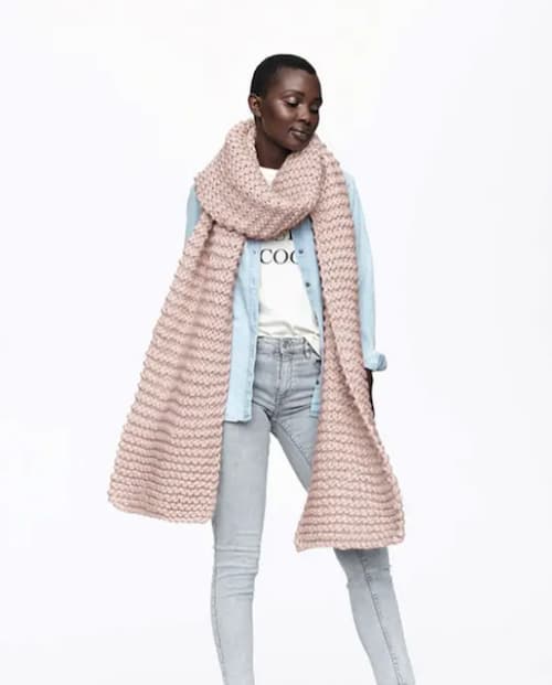 Une écharpe au point mousse réalisée dans une laine épaisse tiendra bien chaud, et ne roulotera pas sur les bords