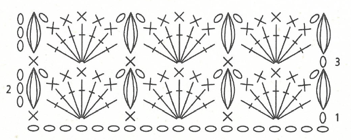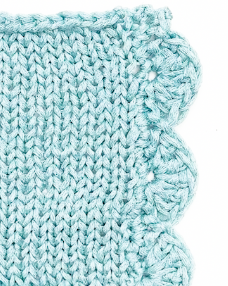 Rang 1: 1 m. en l’air pour la 1re m. serrée, passer 2 m.,7 brides dans la m. suivante, passer 2 m., * 1 m. serrée, passer 2 m., 7 brides dans la m. suivante, passer 2 m. *; répéter de * à * ; terminer par 1 m. serrée.