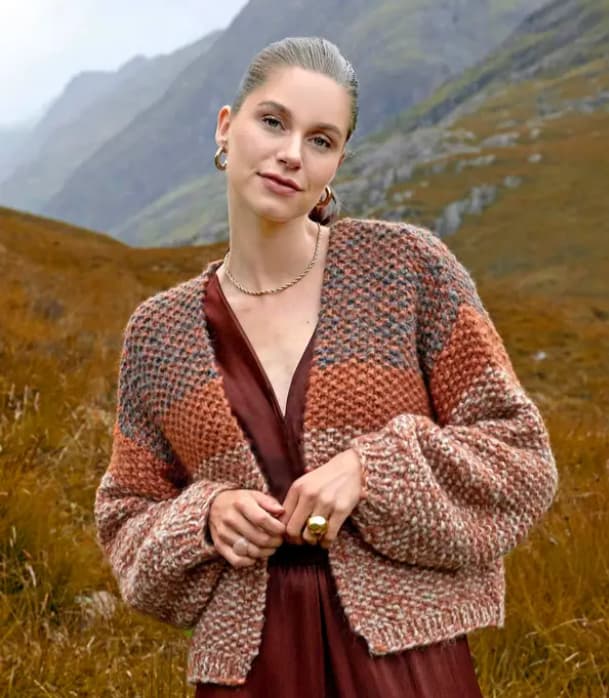 Le point de riz peut être utilisé pour tricoter presque intégralement un gilet ou un pull. Souvent, on le complètera avec le point de côtes, comme ici pour les extrémités des manches et le bas du gilet.