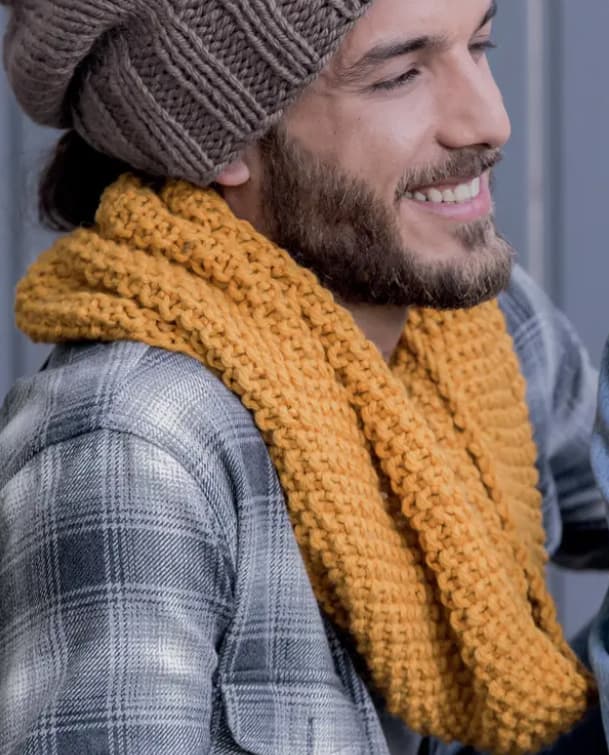 Le point de riz étant réversible, on peut l’utiliser sur des pièces où l’on voit les deux faces du tricot, comme ici ce snood. De même pour le col de la veste pour enfant ci-dessus !
