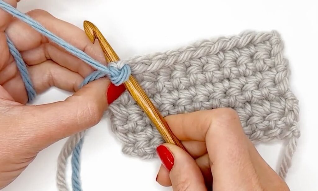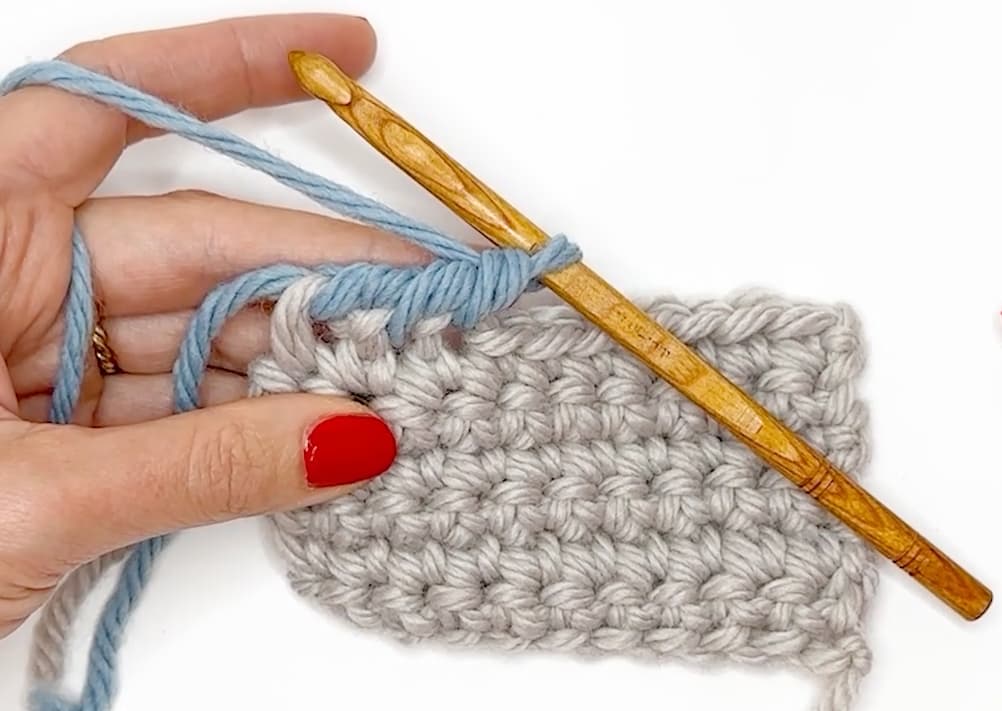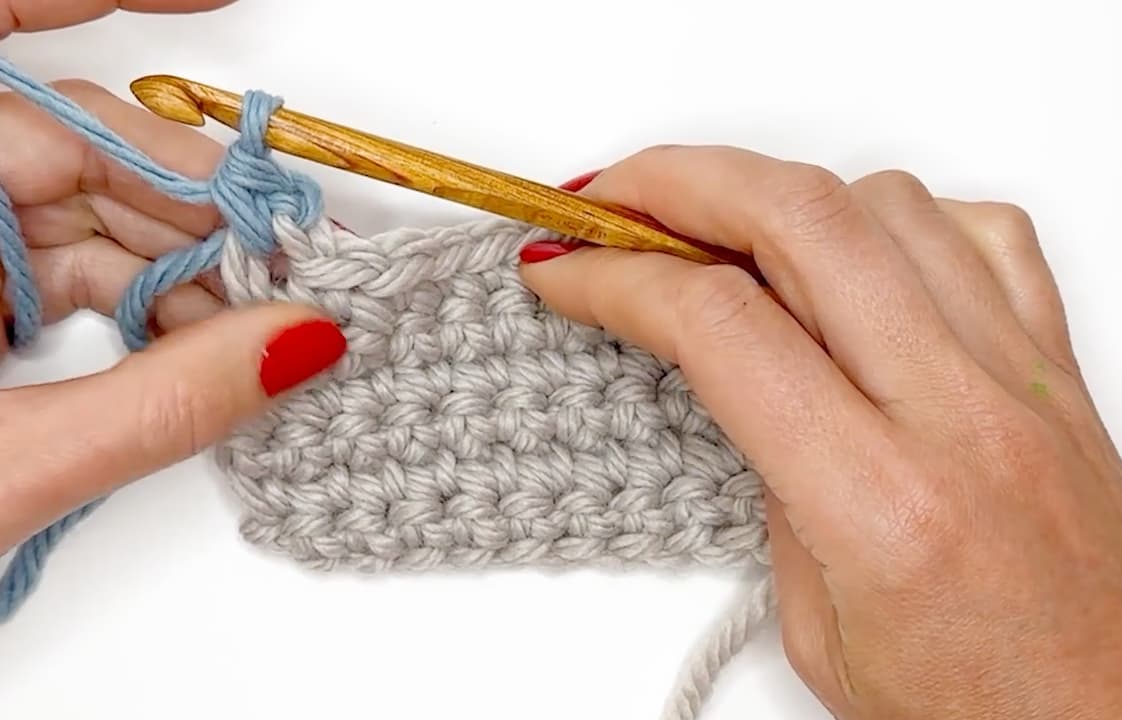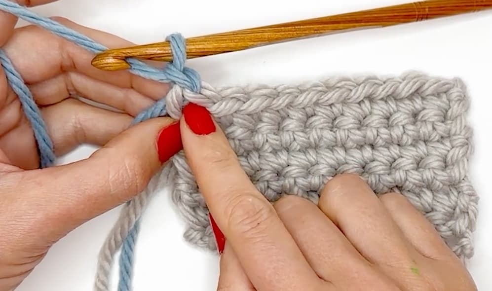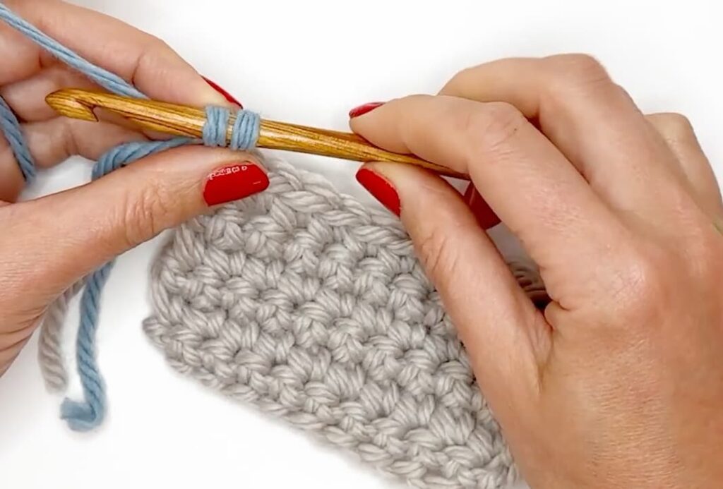 Je vais ensuite réaliser des mailles serrées dans chacune des mailles en revenant sur mes pas comme si je faisais une marche arrière. Je fais bien attention à aller piquer mon crochet dans la 1ère maille serrée (la maille grise pointée sur la photo) et non pas dans la maille en l’air (en bleu juste au-dessus sur la photo).