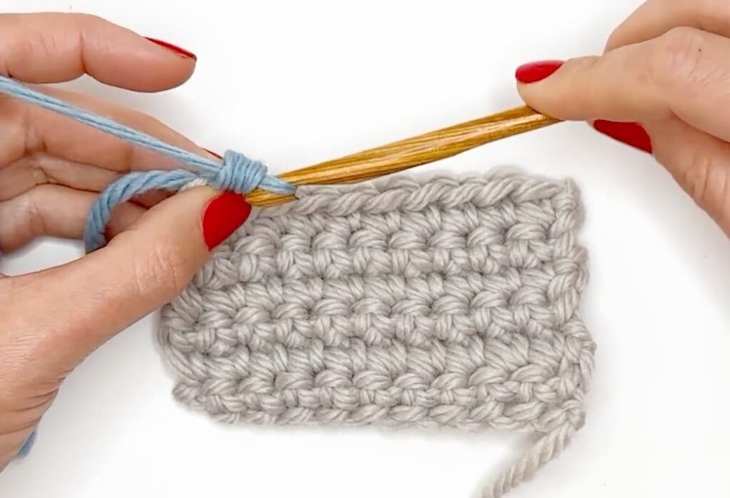 Sur cette image, le point écrevisse est réalisé dans une couleur contrastante pour qu’on voit bien la différence entre l’ouvrage de base (en gris) et la bordure ajoutée (en bleu).