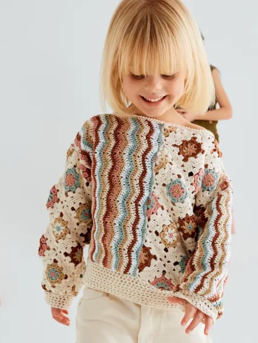 Sur ce top pour enfant, c’est cette fois-ci sur le bas du top que l’on retrouve la bordure crochetée au point écrevisse afin de garantir une bonne tenue à ce point ajouré.