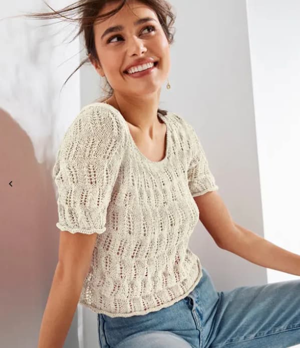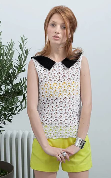 Le même procédé est utilisé aussi sur les emmanchures de ce top ajouré où l’on retrouve une finition au point écrevisse.