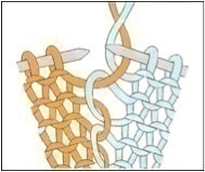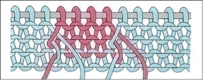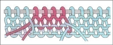 Cette autre technique s’utilise pour le tricotage de larges bandes de couleurs, de grosses rayures verticales ou si vous avez besoin de tricoter des matières différentes. Cette méthode ne crée pas d’épaisseurs supplémentaires sur l’envers du travail.