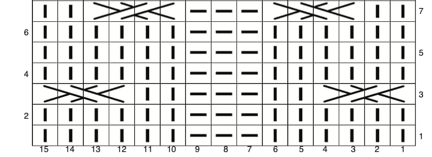Pour les torsades réalisées sur un petit nombre de mailles, on peut compter le nombre de traits qui se croisent. Par exemple, le symbole ci-dessous est tout simplement constitué de 4 traits qui se croisent :