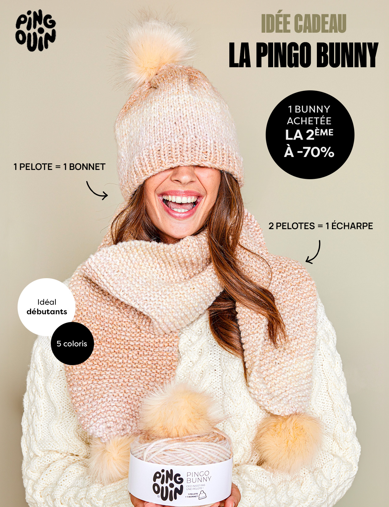 -70% sur la 2ème pelote Pingo Bunny. Idéale pour les débutants, facile et rapide, en un tour de main, réalisez un joli bonnet à pompon ou 1 écharpe à pompons.